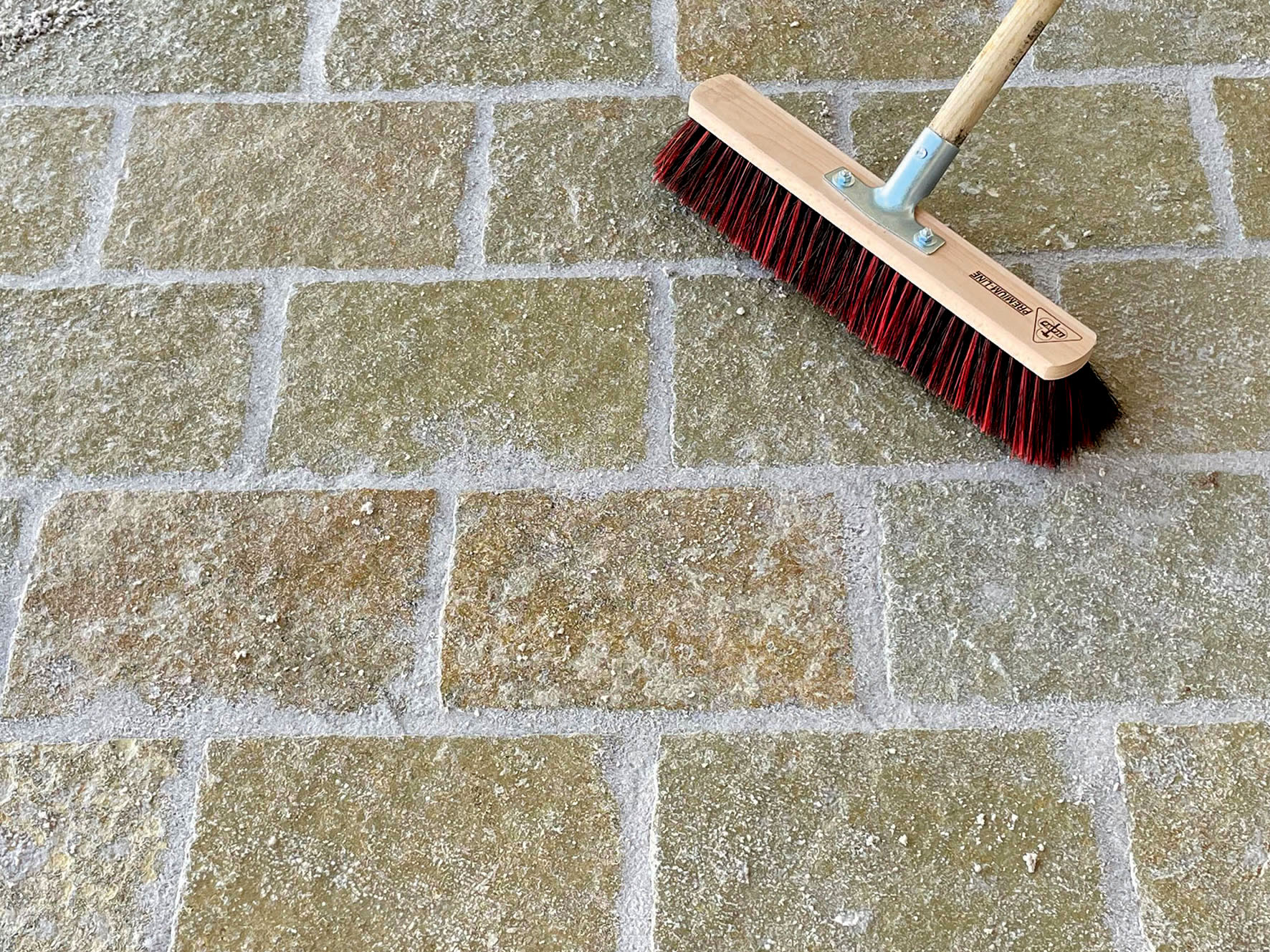 Immédiatement après le jointoiement, nettoyez délicatement la surface des dalles ou pavés avec un balai de rue à poils moyens, en diagonale par rapport au joint. Enlevez tous les restes de mortier de la surface. Les résidus balayés ne doivent plus être utilisés. Veillez à ce que les chanfreins (biseautage des bords latéraux) des dalles et des pavés soient dégagés.
