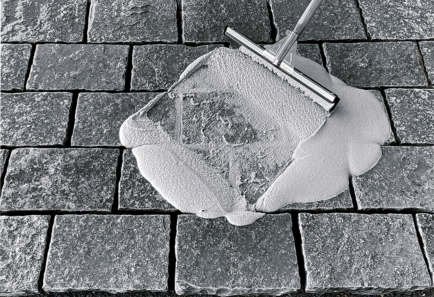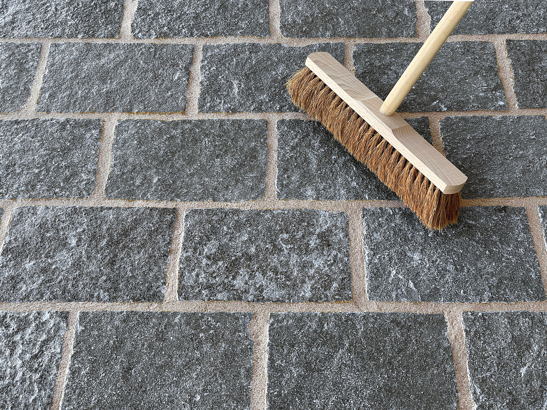 Après environ 10-20 minutes, balayez la surface avec précaution et en diagonale par rapport aux joints, à l’aide d’un balai de rue à poils moyens. Si des stries blanches gélatineuses se forment sur la surface de la pierre, cela signifie que le bon moment pour balayer n’est pas encore atteint. Enlevez ensuite les restes de mortier avec un balai fin en fibres de coco. Le matériau balayé ne doit plus être utilisé. Veillez à ce que les chanfreins (biseautage des bords latéraux) des dalles et des pavés soient dégagés.